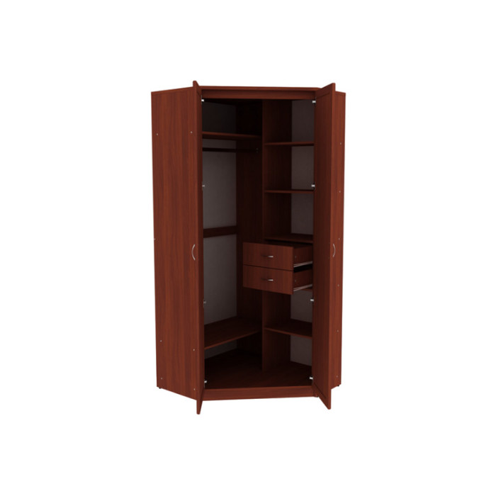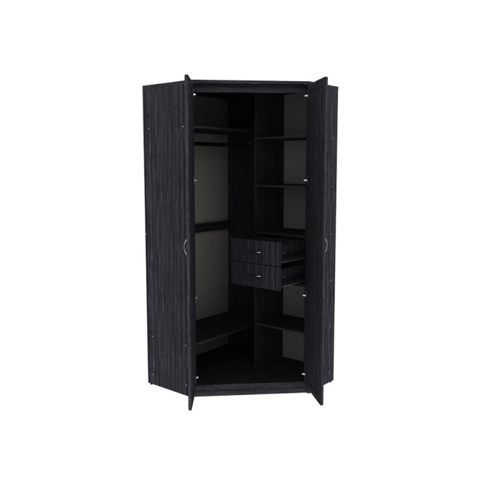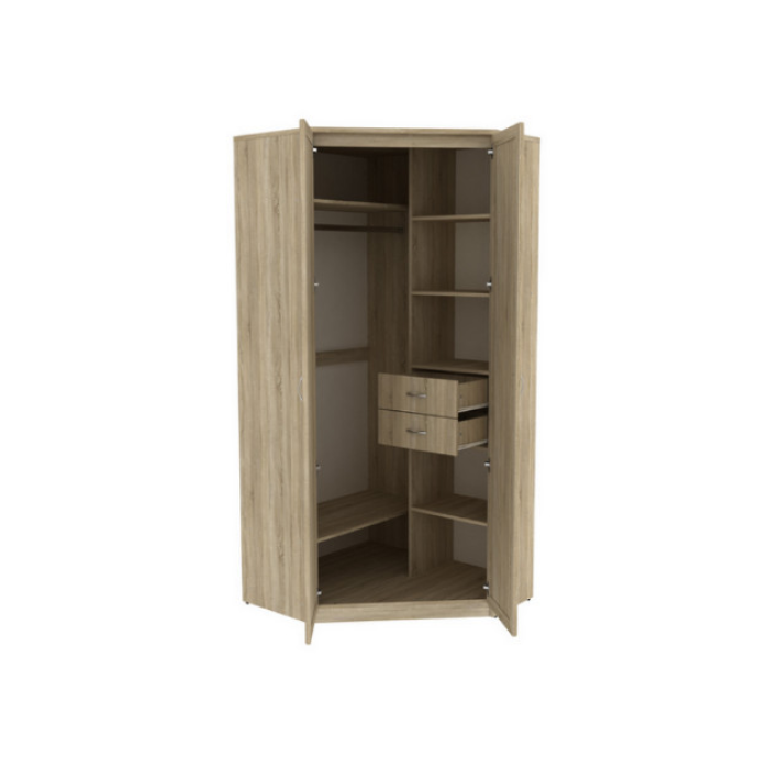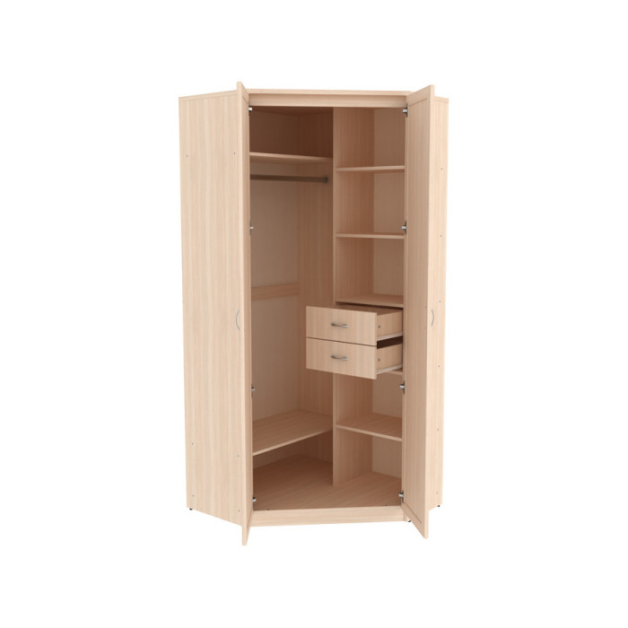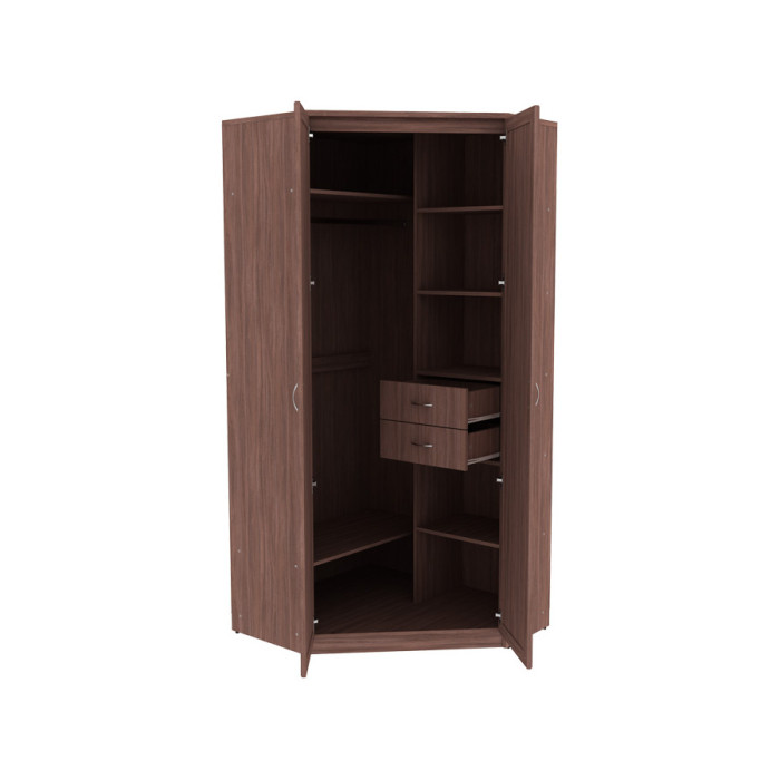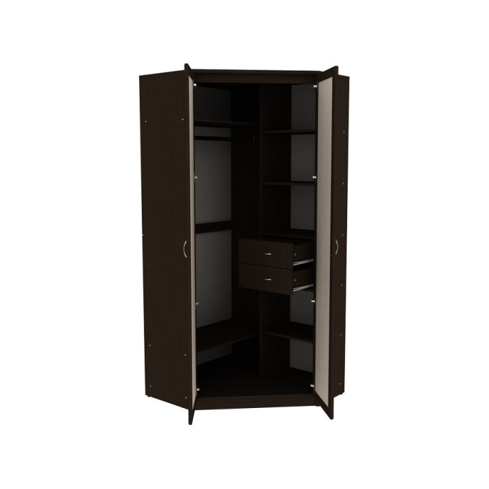 практичное хранение — внутреннее наполнение модели представлено и штангой для вешалок, и секцией с полками, и парой выдвижных ящиков.